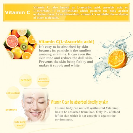 - Vitamin C: Bietet starken, essentiellen antioxidativen Schutz gegen vorzeitige Hautalterung. Feine Linien und Falten werden gemindert, um straffere, hellere Haut zu enthüllen. Vitamin C dringt direkt in die Dermis ein und fördert die Kollagenproliferation aus den Zellen. Hilft, Hautschäden zu reparieren. Es ist ein kraftvoller Antioxidant, der die Haut vor den schädlichen Auswirkungen von UV-Strahlen schützt.