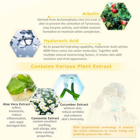 Speziell formuliert mit einer effektiven Kombination aus Vitamin C und Arbutin-Extrakt, um die Aktivierung von Tyrosinase zu hemmen. Es verhindert die Ablagerung von Pigmenten und eliminiert Melanin. Die pflanzlichen feuchtigkeitsspendenden Inhaltsstoffe, einschließlich Gurkenextrakt, Kamillenextrakt und Aloe-Vera-Extrakt, helfen, die Haut zu verfeinern und die Hydratation sowie die Anti-Aging-Vorteile zu verbessern.