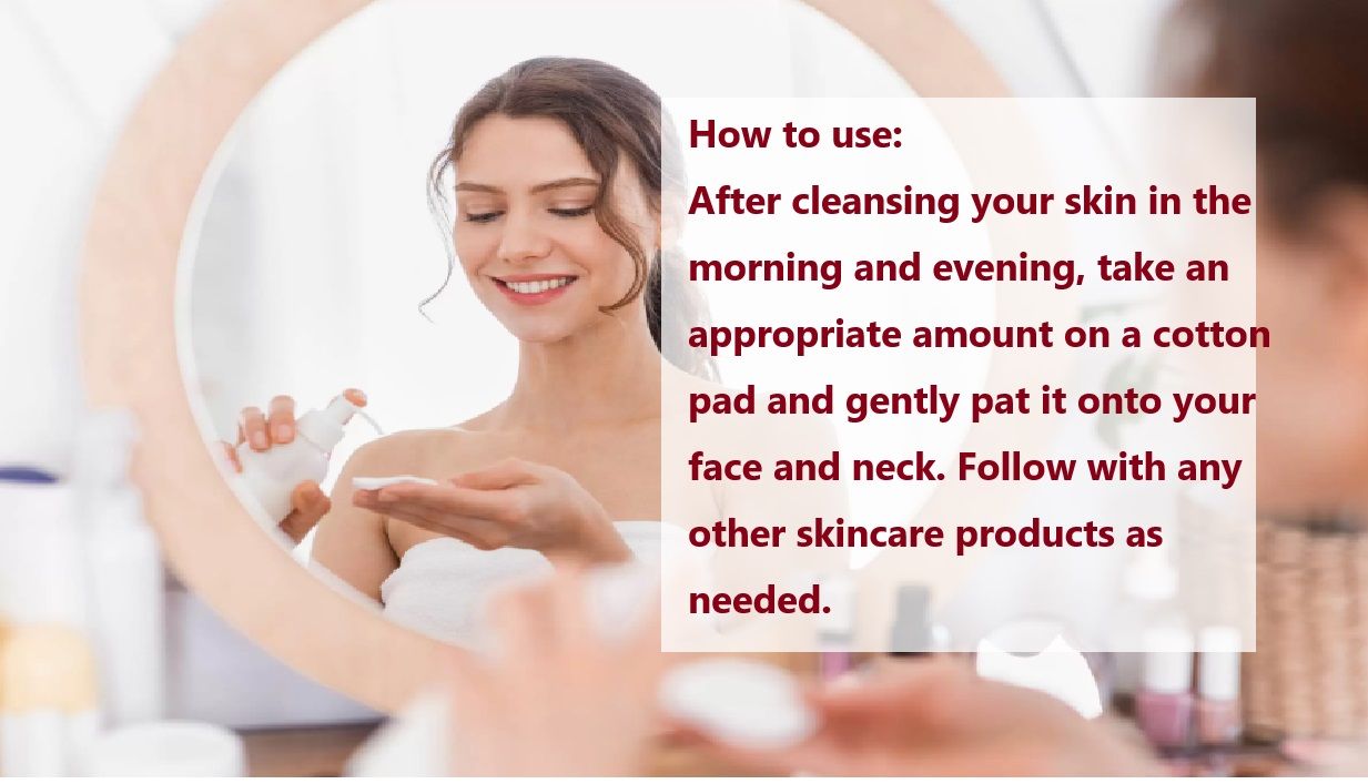 1. Reinigen Sie die Haut morgens und abends, nehmen Sie eine angemessene Menge auf ein Wattepad, tupfen Sie sanft Ihre Haut im Gesicht und am Hals ab und verwenden Sie dann nach Bedarf andere Hautpflegeprodukte.
