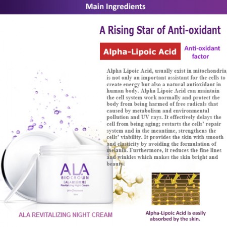A1: Alpha Lipoic Acid, usually exist in mitochondria, is not only an important assistant for the cells to create energy but also a natural antioxidant in human body. Alpha Lipoic Acid can maintain the cell system work normally and protect the body from being harmed of free radicals that caused by metabolism and environmental pollution and UV rays. It effectively delays the cell from being aging; restarts the cells’ repair system and in the meantime, strengthens the cells’ viability. It provides the skin with smooth and elasticity by avoiding the formulation of melanin. Furthermore, it reduces the fine lines and winkles which makes the skin bright and beauty.