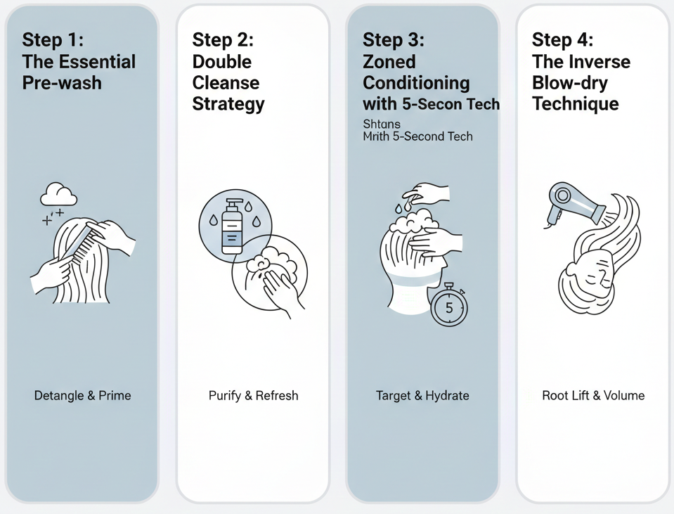 Démêlez avant de mouiller, ne sautez jamais l'étape du brossage ! Utilisez un peigne à dents larges pour enlever délicatement les mèches lâches et démêler les nœuds avant d'entrer sous la douche. Cela prévient la casse causée par la "friction humide" et soulève la poussière de surface, permettant à votre shampoing d'agir directement sur le cuir chevelu. Enlever les mèches "mortes" tôt est le premier secret pour une finition légère et aérienne.