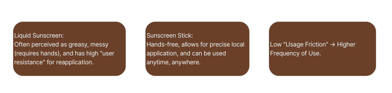 Les lotions solaires traditionnelles présentent plusieurs points de douleur : elles laissent les mains collantes, sont difficiles à réappliquer en déplacement et sont soumises à des restrictions de liquide pour les voyages en avion. Le stick solaire résout simultanément trois niveaux : les scénarios d'utilisation, les points de douleur de la formulation et la différenciation des canaux.