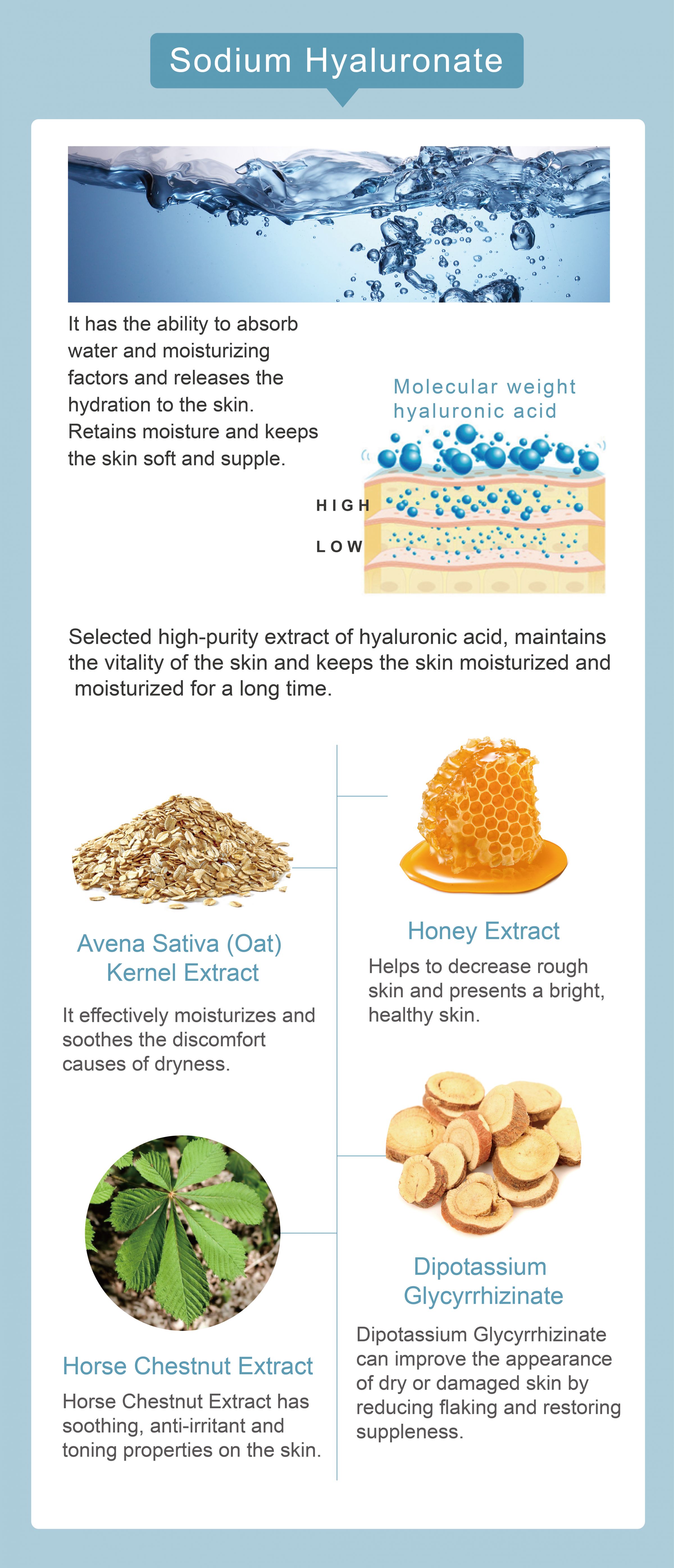 यह पानी को शोषित करने और मॉइस्चराइजिंग कारकों को अवशोषित करने की क्षमता रखता है और त्वचा को हाइड्रेशन प्रदान करता है। नमी को बनाए रखता है और त्वचा को मुलायम और मुलायम रखता है। हायलूरोनिक एसिड के चयनित उच्च-शुद्धता निष्कर्ष को बनाए रखता है, त्वचा की जीवनशक्ति को बनाए रखता है और त्वचा को लंबे समय तक मॉइस्चराइज्ड और मॉइस्चराइज्ड रखता है।