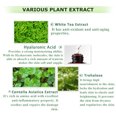 - Trehalosio --- Porta alta nutrizione alla pelle; blocca l'idratazione e rende la pelle elastica e luminosa. Previene la secchezza della pelle e regolarizza la pelle.