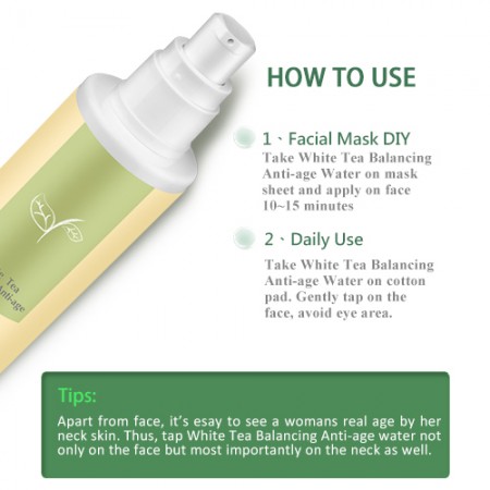 Applicare una quantità appropriata di Acqua Antinvecchiamento Equilibrante al Tè Bianco uniformemente sulla pelle mattina e sera. Massaggiare delicatamente fino a completo assorbimento.