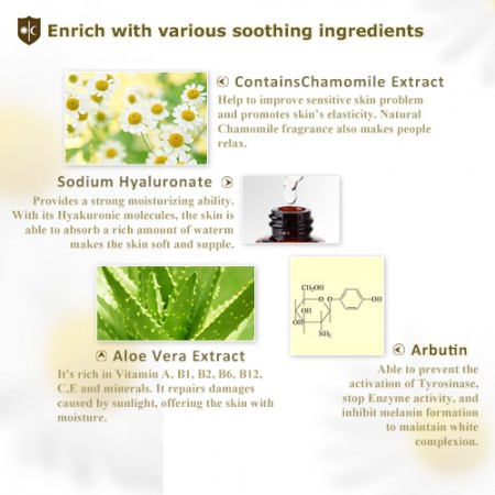 Ekstrak Chamomile --- Diperoleh daripada ekstrak kelopak yang mengandungi Bisabolol dan D-Flavanoids. Memberikan sifat menenangkan kepada kulit. Mengurangkan keradangan dan kerengsaan. Memudarkan bintik gelap dan mengurangkan kekasaran permukaan kulit.