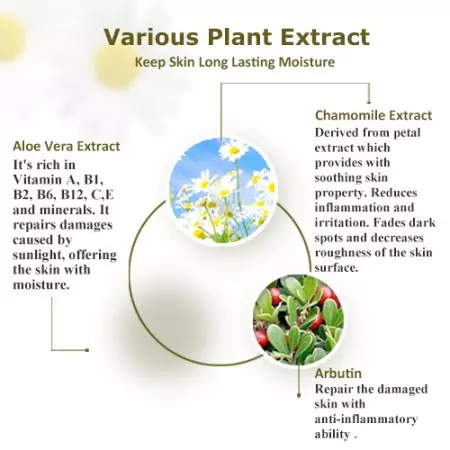- Ekstrak Lidah Buaya --- Ia kaya dengan Vitamin A, B1, B2, B6, B12, C, E dan mineral. Ia membaiki kerosakan yang disebabkan oleh cahaya matahari, memberikan kelembapan kepada kulit.