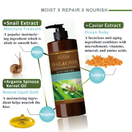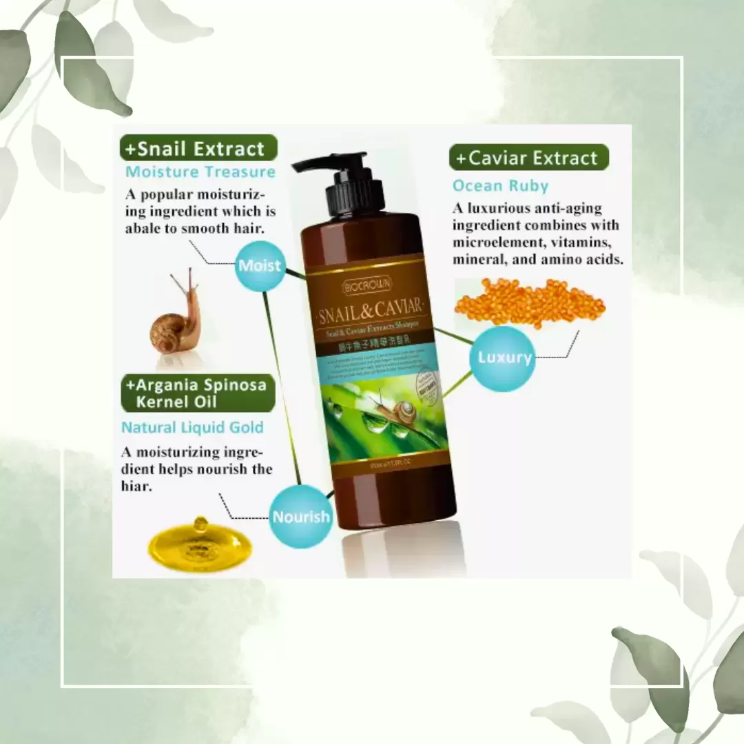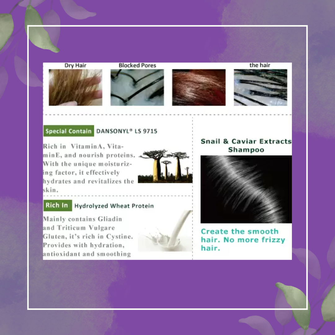 Slak- & Kaviaarextract Shampoo bevat arganolie, slakextract en kaviaarextract. Het hydrateert, voedt en herstelt het haar, waardoor het zijdezacht en zonder frizz blijft.
