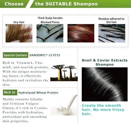 Maak het haar nat. Neem een geschikte hoeveelheid Slak- & Kaviaar Extract Shampoo en wrijf om te schuimen. Masseer door het natte haar en spoel grondig uit. Was het haar opnieuw indien nodig.