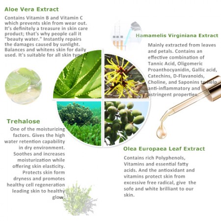 - Extrato de Folha de Olea Europaea: Contém ricos polifenóis, vitaminas e ácidos graxos essenciais. E os antioxidantes e vitaminas protegem a pele dos radicais livres excessivos, proporcionando suavidade e um brilho branco à nossa pele.
