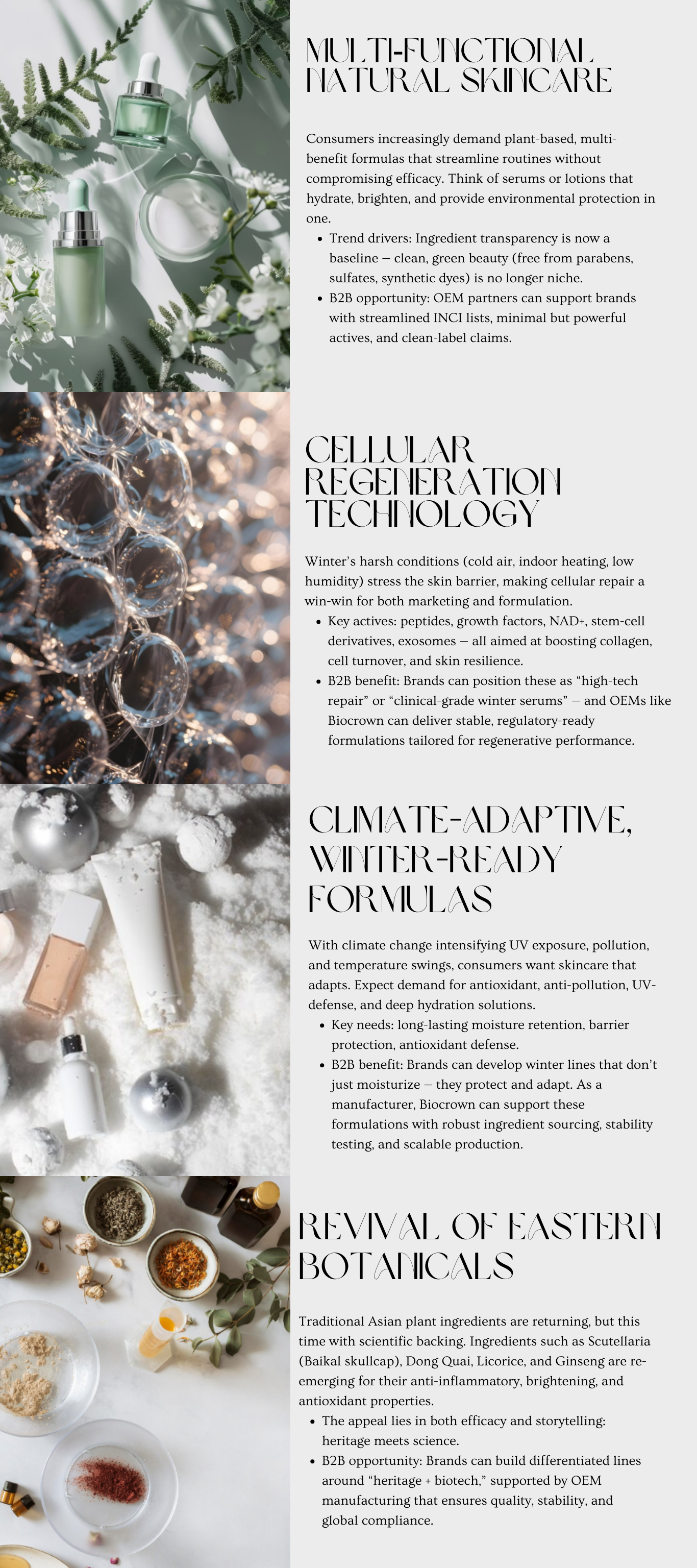 Khi ngành công nghiệp làm đẹp phát triển nhanh chóng, mùa đông năm 2025 đến 2026 sẽ mang đến những cơ hội chăm sóc da mới cho các thương hiệu và đối tác OEM/ODM. Tại BIOCROWN, chúng tôi thấy bốn xu hướng chính đang định hình thị trường — và chúng tôi sẵn sàng giúp bạn tận dụng chúng thành các dòng sản phẩm nhãn hiệu riêng hiệu suất cao, sẵn sàng cho tương lai.