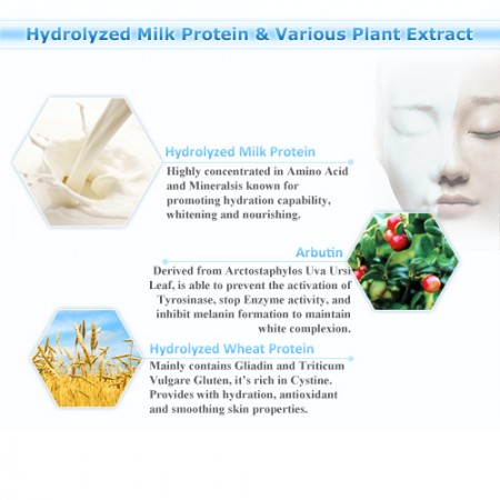 Được làm giàu với protein sữa, nó chứa các axit amin và khoáng chất giúp cung cấp độ ẩm và kích hoạt quá trình trao đổi chất của da. Nó cũng chứa tinh chất arbutin để giảm thiểu sự xuất hiện của các đốm tối màu và ngăn ngừa sự lắng đọng sắc tố. Thêm vào đó, nó được chiết xuất từ các loại thảo mộc như lô hội, dưa chuột và hoa cúc để cung cấp độ ẩm cho da và giúp làm mờ các đốm.