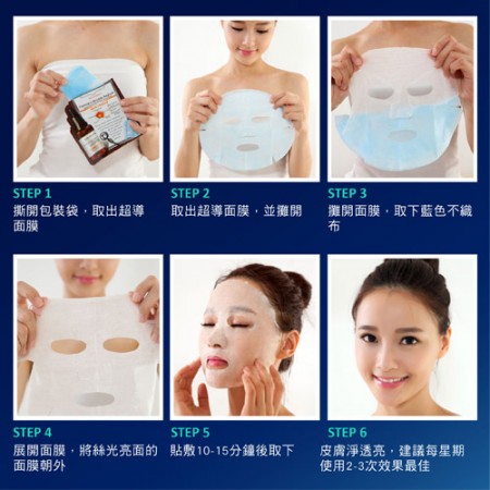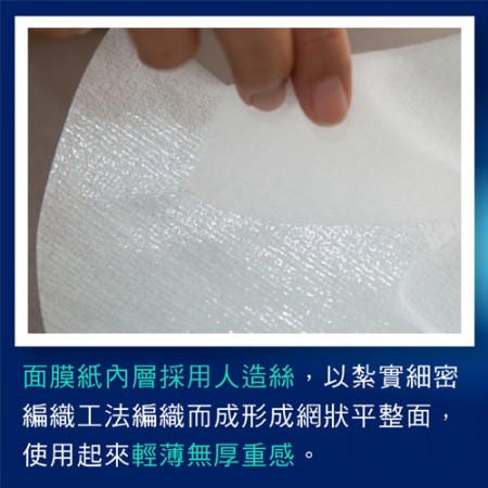 - 1.熱融合加壓技術 ▶▶ 將PET超導薄膜以熱融合加壓模式結合於人造絲纖維布,採無縫接連讓面膜合貼肌膚。