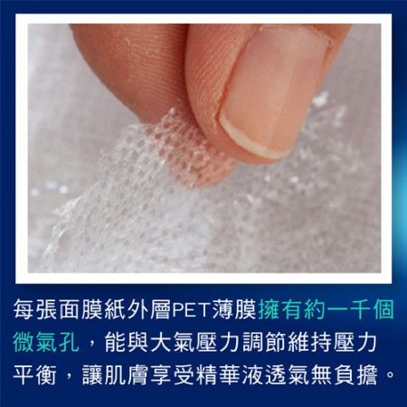 - 4.微氣孔通透設計 ▶▶ 每片面膜擁有約一千個微氣孔,與空氣中的大氣壓力調節,提升面膜使用上透氣感。