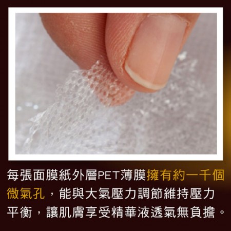 - 4.微氣孔通透設計 ▶▶ 每片面膜擁有約一千個微氣孔,與空氣中的大氣壓力調節,提升面膜使用上透氣感。